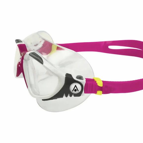 La gafa de natación Vista está diseñada con una máscara de silicona y lente transparente. El borde de silicona suave y la hebilla de un solo toque proporcionan un ajuste cómodo y personalizado.