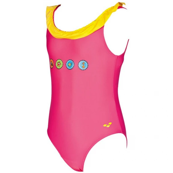 El bañador Arena Crowncaps para niñas viene en bonitos tonos de verano con un adorable estampado Arena Water Tribe. Cuello de volantes en contraste para un toque de color agregado.